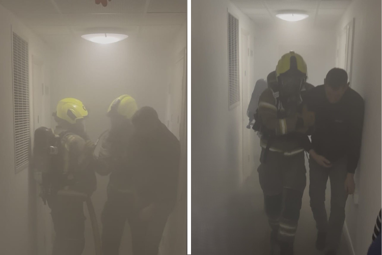 See above for photos from this Blackout Test, as the smoke cleared and somebody taking part in the staged event was helped out of the building.